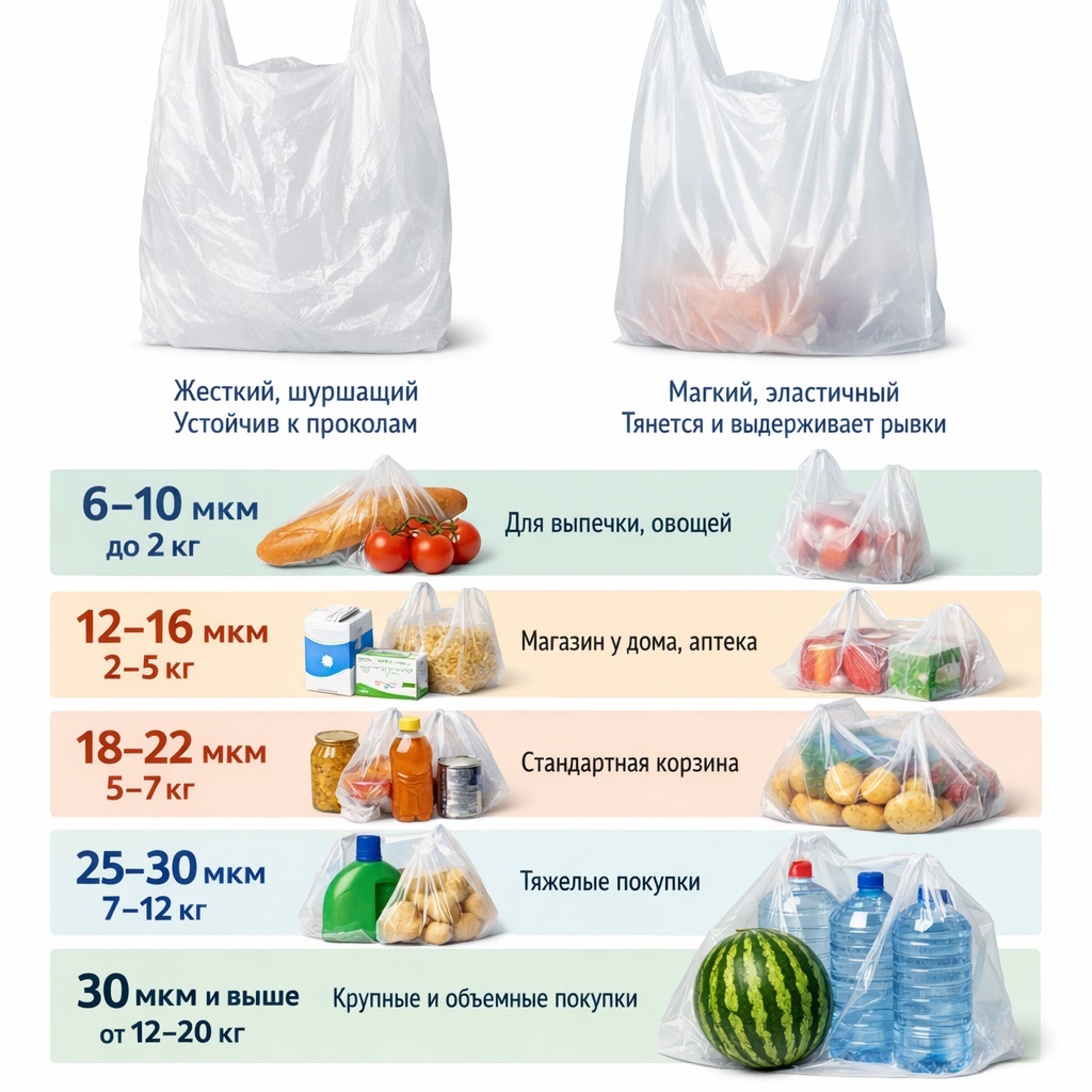 У пакета-«майки» вся нагрузка концентрируется в зоне ручек и боковых швов. Поэтому при весе свыше 5 кг разумно переходить к диапазону от 20 мкм и выше.