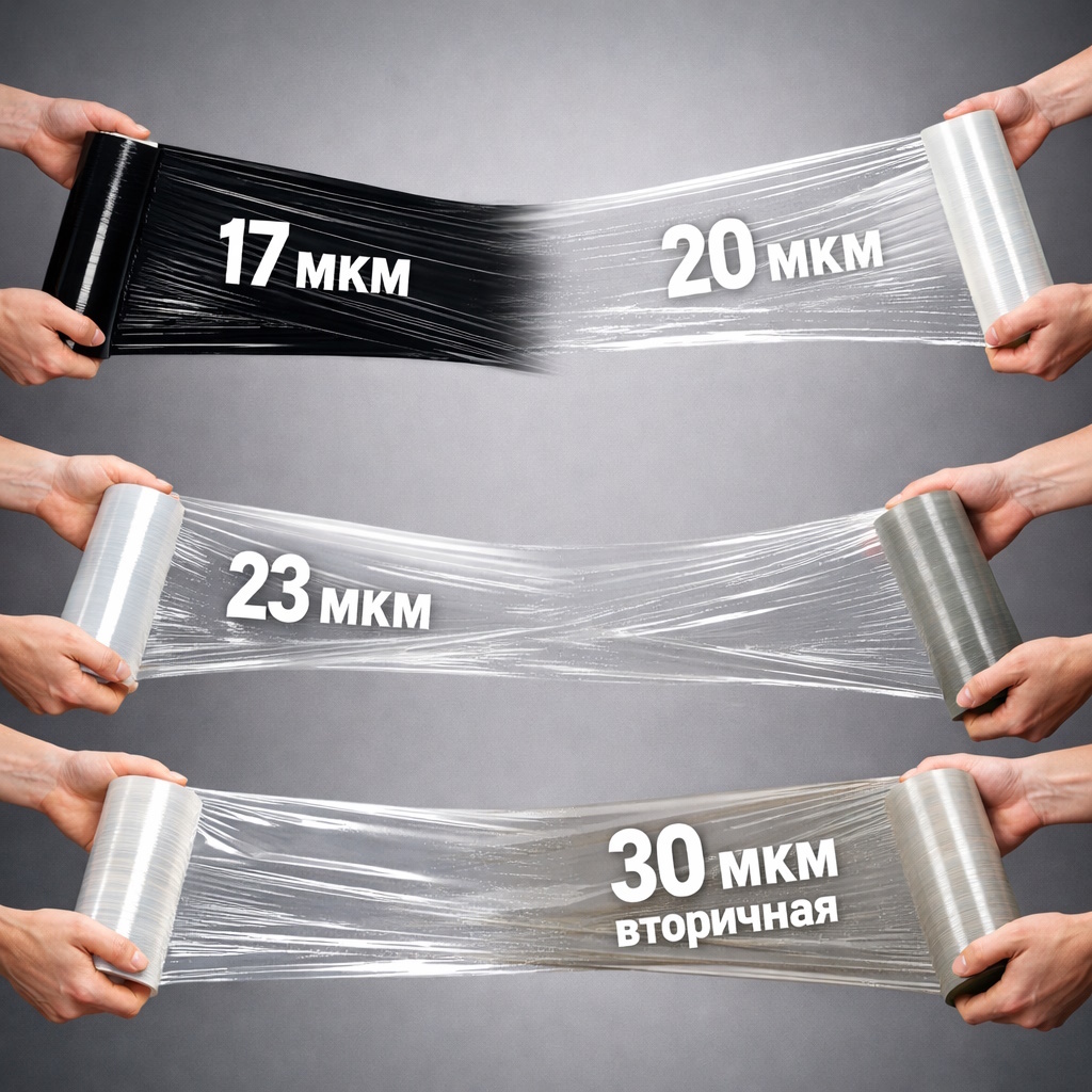 Почему так: на оборудовании пленка работает в режиме предрастяжения, и Вы платите не только за «толщину», а за то, как она растягивается и держит нагрузку.